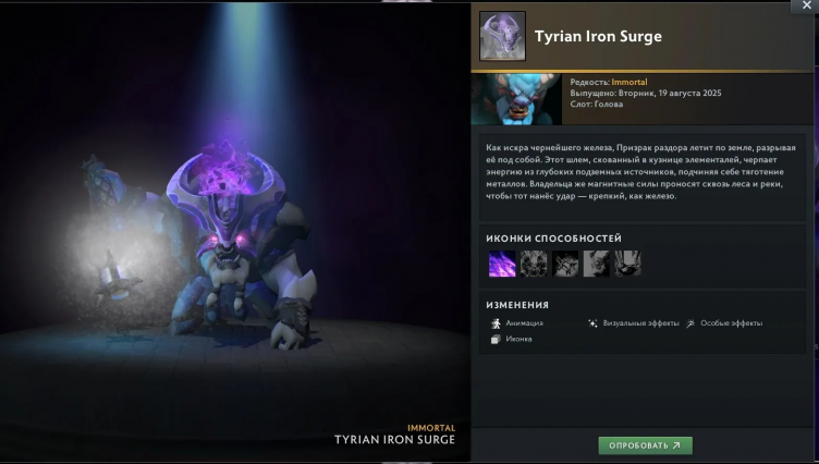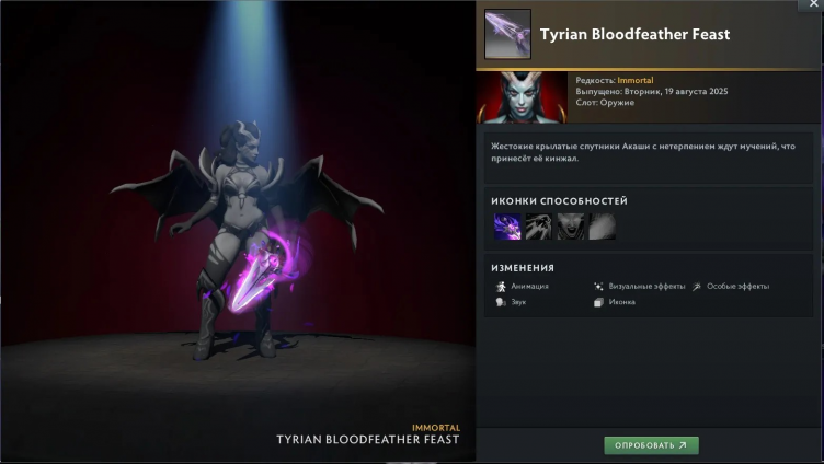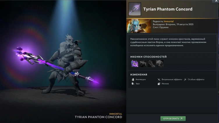 Сами предметы появились в Dota 2 значительно раньше – Tyrian Regalia содержит их обновленные версии в тонах The International 2025 и с измененными анимациями способностей.