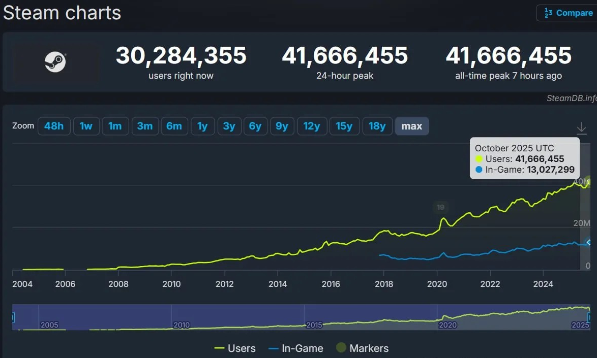 12 октября сервисом Steam пользовались одновременно 41.6 млн человек в пике – это новый рекорд платформы по онлайну. У более 13 млн человек при этом была запущена какая-то игра.