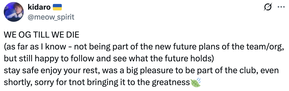 Мы OG до самой смерти. Насколько мне известно, я не вхожу в планы на будущее команды/организации, но все равно с удовольствием буду следить и смотреть, что нас ждет в будущем. Берегите себя, наслаждайтесь отдыхом, было очень приятно быть частью клуба, пусть даже и ненадолго, извините, что не смог довести его до совершенства.