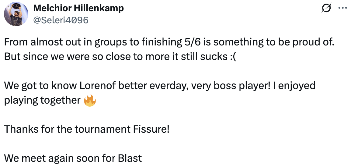 Пройти путь от почти вылета в группах до попадания в топ-5/6 – это то, чем можно гордиться. Но, конечно, обидно, ведь мы были так близки к большему :( С каждым днём мы всё лучше узнавали Lorenof – отличный игрок, настоящий босс! Мне было приятно играть вместе. Спасибо за турнир, FISSURE! Скоро встретимся снова – на BLAST. Домашний турнир для нашего MidOne, так что он точно там будет :)