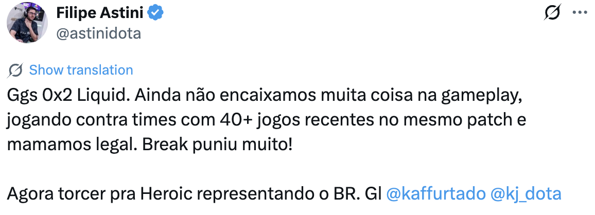 GG, Team Liquid. Пока у нас мало что получается в игре: играем против команд, которые провели более 40 матчей на этом патче. Перерыв явно сказался! Теперь будем болеть за HEROIC, представляющую Бразилию! Удачи, kaffs и KJ.
