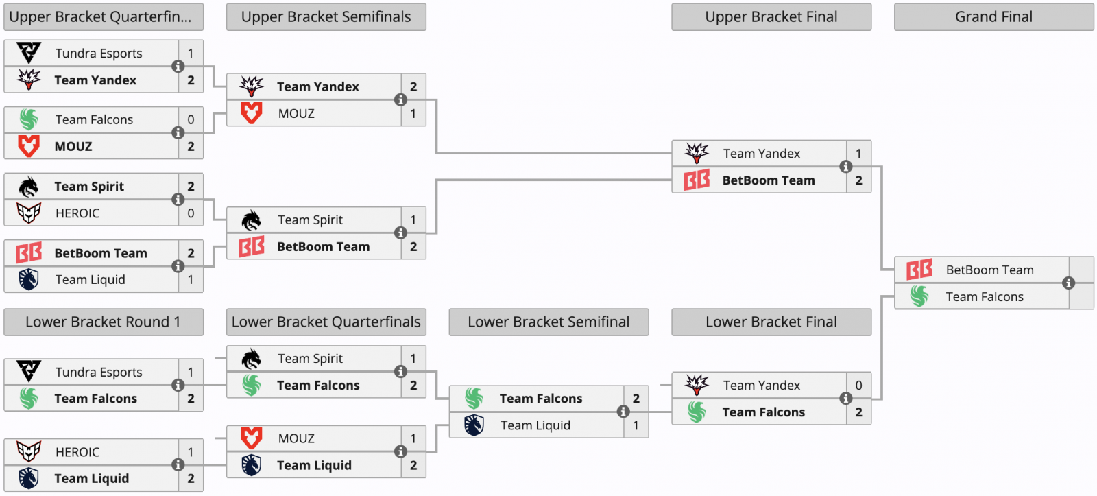 Team Yandex заняла третье место на турнире и заработала 105 тысяч долларов призовых. Team Falcons, в свою очередь, прошла в гранд-финал, где сегодня встретится с