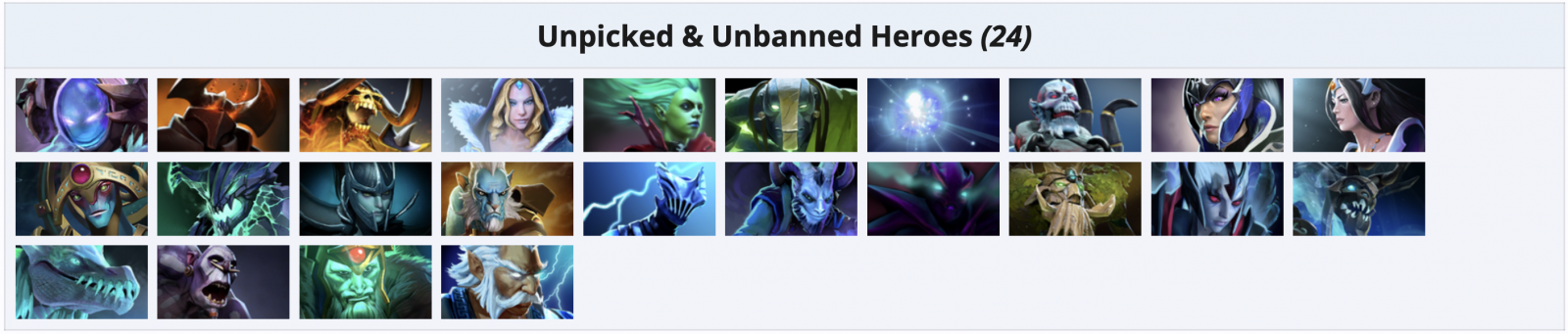 24 персонажа были полностью проигнорированы участниками FISSURE PLAYGROUND 2 по Dota 2 по итогам чемпионата. Полный список героев, которых ни разу не пикнули и не забанили на турнире, выглядит следующим образом: