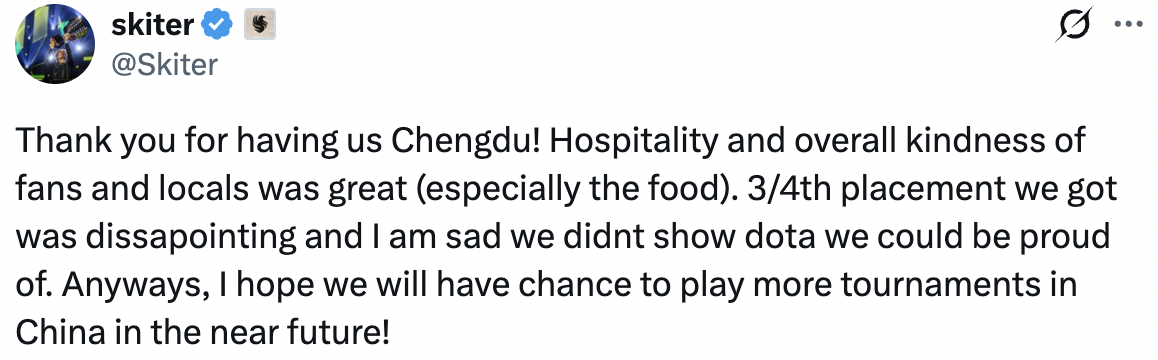 Спасибо, что приняли нас, Чэнду! Гостеприимство и доброжелательность фанатов и местных жителей были на высшем уровне (отдельно стоит отметить еду). 3-4 место разочаровало, и мне грустно, что мы не показали ту Доту, которой могли бы гордиться. В любом случае надеюсь, что у нас будет шанс сыграть больше турниров в Китае в ближайшем будущем!