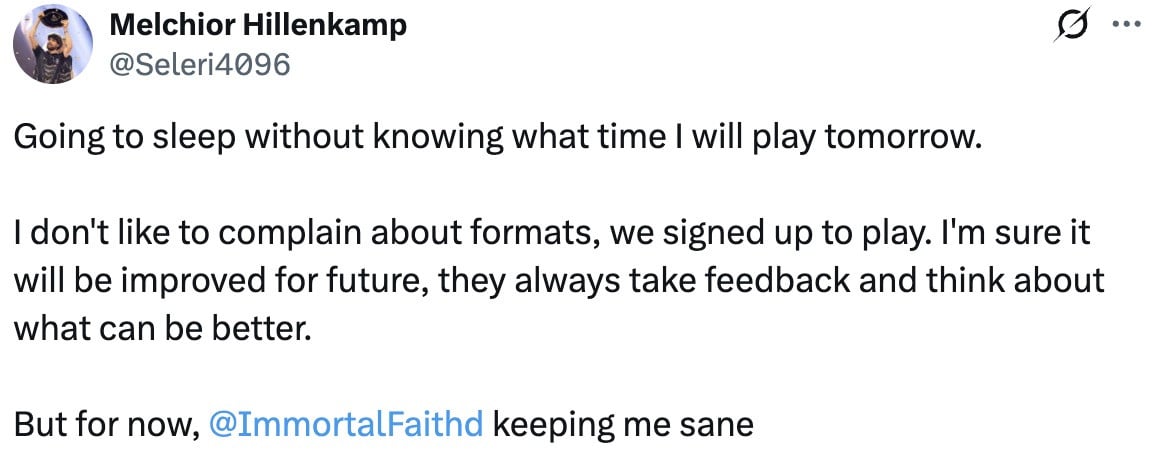 Ложусь спать, не зная, во сколько завтра играть. Не люблю жаловаться на формат турниров, мы сами подписались играть. Я уверен, что этот момент усовершенствуют в будущем. Они всегда берут во внимание обратную связь и думают о том, как сделать лучше. А пока только ImmortalFaith не дает мне сойти с ума.