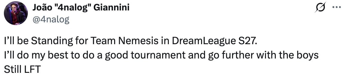 Я буду стендином Team Nemesis на DreamLeague Season 27. Постараюсь показать хороший результат на турнире и пройти дальше с ребятами. Все еще в поиске команды.