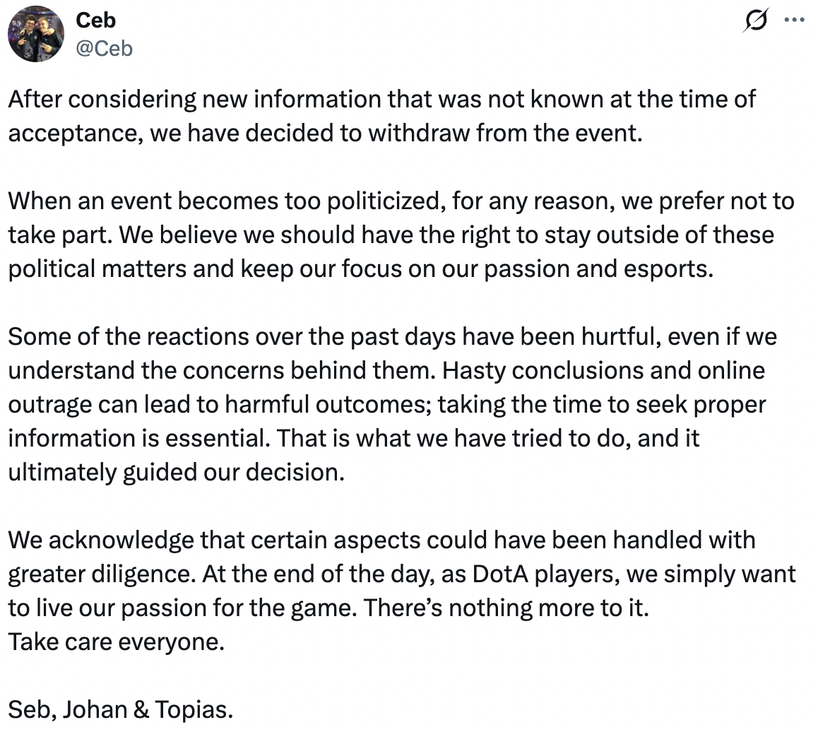 Мы не хотим принимать участие в чемпионате, когда он становится слишком политизированным по какой-либо причине. Мы считаем, что у нас должно быть право не касаться политических моментов и фокусироваться только на киберспорте и нашей страсти к соревнованиям.