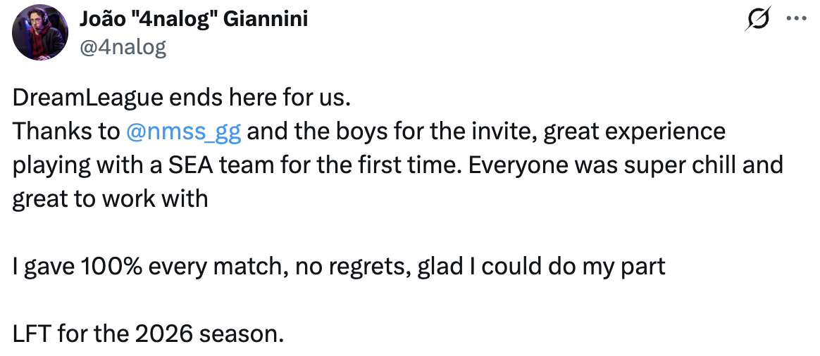 На этом заканчивается DreamLeague Season 27 для нас. Спасибо Team Nemesis и парням за приглашение – это был отличный опыт, впервые сыграл с командой из Юго-Восточной Азии. Все были максимально спокойными, классно было работать вместе. Я выкладывался на 100% в каждом матче и ни о чем не жалею. Рад, что смог внести свой вклад.