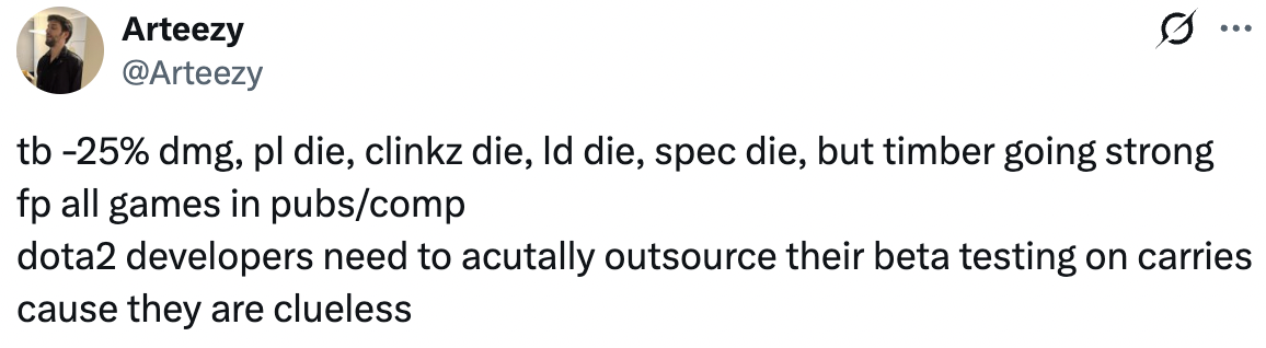 У Terrorblade -25% урона, Phantom Lancer умер, Clinkz умер, Lone Druid умер, Spectre умерла, но Timbersaw по-прежнему силен, первый пик во всех пабликах и соревновательных играх. Valve нужно передать бета-тестирование керри на аутсорсинг, потому что сами они ничего не понимают.