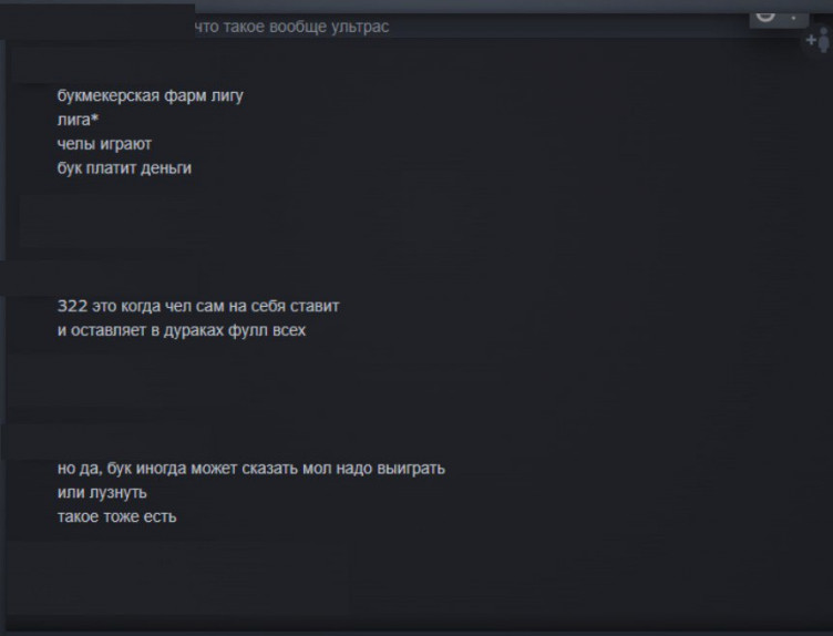 сейчас буду поднимать неприятную тему для нас, но лучше я это сделаю, чем молодые игроки попадут в эту ловушку и испортят свое будущее. я всегда открыта помочь молодым пацанам, особенно если они планируют прийти в киберспорт, парни спокойно могут спросить меня за ростер, игроков, турниры и все что я буду знать на тот момент (как минимум смогу предостеречь). в течении недели ко мне обратилось пару крутых малых по турниру Ультрас (Ultras Dota Pro League) куда ребят приглашали играть, но не просто, а для бука и турнира. с малыми поговорили, благо они молодцы и поняли, что это за люди и что им это не нужно. долго думала, что делать с данной информацией - можно было попросить малых вступить туда и узнать информацию, можно собрать список игроков, которые там играют - 50 сезонов!, но столько сил было положено на работу с 322 турнирами, которые не дали результата, попыткой привлечь к ответственности, а так же вовлеченность ответственных ТО к данному вопросу, которые стопили расследование, чтобы вокруг их имени не было вопросов, нечестные игроки, которые до сих пор спокойно могут играть в соревновательную доту и спокойно на стримах рассуждают вопросы о 322 и переворачивают реальность, как им удобно, чтобы вернуться. был момент, где мы за руку с Эдом zverHDD (спасибо за работу) приводили и свидетелей и организаторов и участников к ТО, но это не дало результат, поэтому я не буду просить малых вступить в эту грязь, чтобы раскрыть типов и найти бетонные доказательства. просто предупреждаю - для себя я составлю список игроков оттуда, кто-то играл с мейнов, кто-то со смурфов ( имеем возможность узнать кто) , кто-то у меня в общих друзьях с тем кто хантит малых (да я вас тоже сохраню и дам информацию по вам) и постараюсь в дальнейшем не пересекаться в работе. так что думайте 100гривен вин, 50 гривен луз и 100 гривен за колл на луз стоят вашего будущего