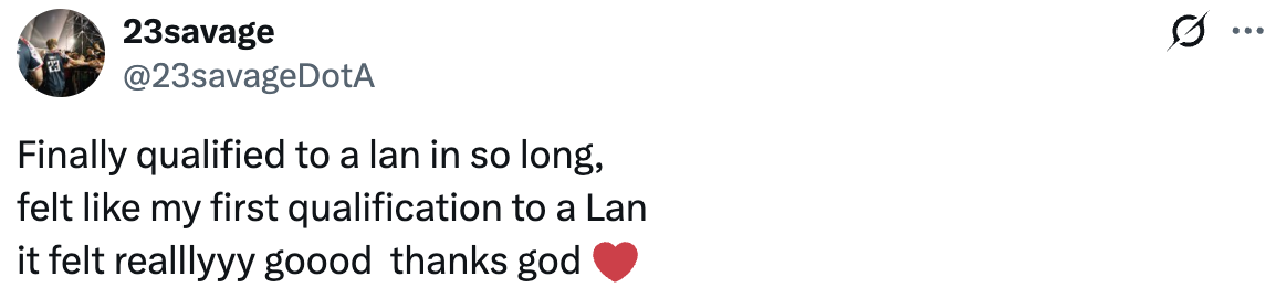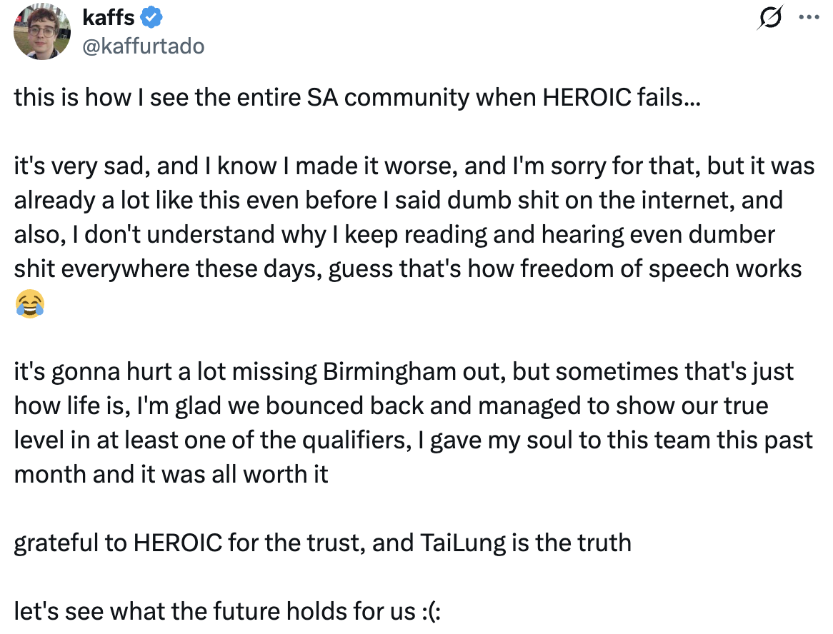 Будет очень больно пропустить ESL One Birmingham 2026, но иногда так бывает в жизни. Я рад, что мы смогли отыграться и показать свой настоящий уровень хотя бы в одной квалификации. Я отдал этой команде всю душу в прошлом месяце, и все это того стоило. Благодарен HEROIC и TaiLung за доверие. Посмотрим, что нас ждет в будущем :(: