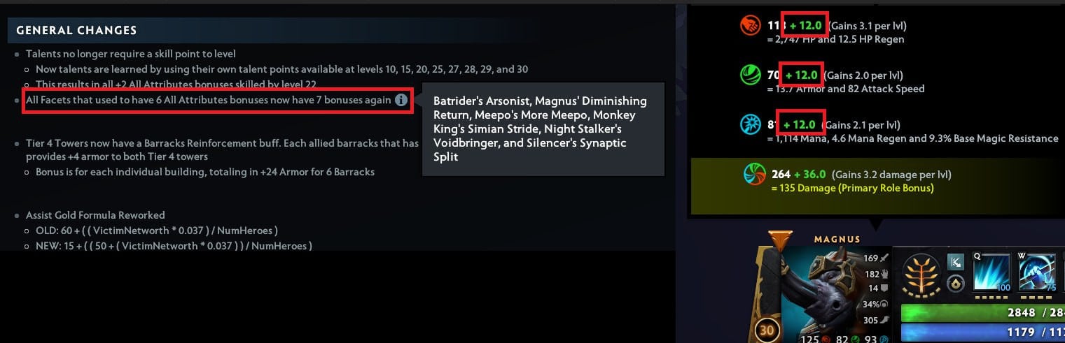 Новое обучение это хорошо, но ещё лучше было бы обратиться к изменениям, сокрытым за спойлером в 7.40. В патчноуте указано, что если у героя из-за определённого аспекта уровень способности не стандартный (>4 для не ультимейтов), то доп. атрибутов у героя будет 7, а не 6 как раньше. Сделано было из-за того, что 1 уровень + терялся. По классике жанра то, что разработчики прячут за спойлер патчноута, в саму игру не добавляется, так что у героев по-прежнему 6 уровней доп. атрибутов (или +12 ко всем характеристикам).