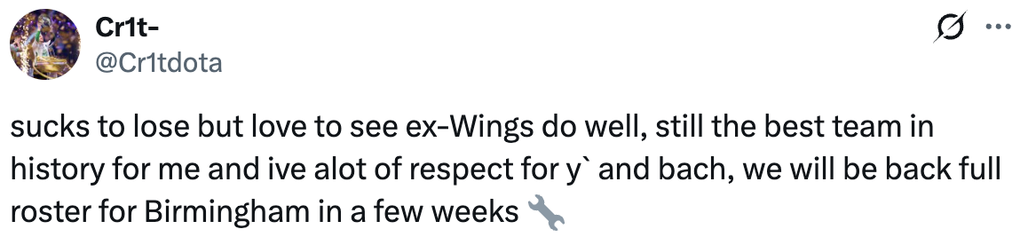 Обидно проигрывать, но приятно видеть, что бывшие игроки Wings выступают хорошо. Для меня это все еще лучшая команда в истории, и я очень уважаю y` и bach. Мы вернемся в полном составе на турнире в Бирмингеме через несколько недель.